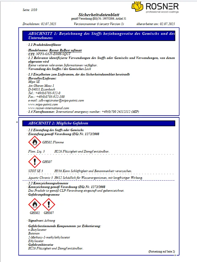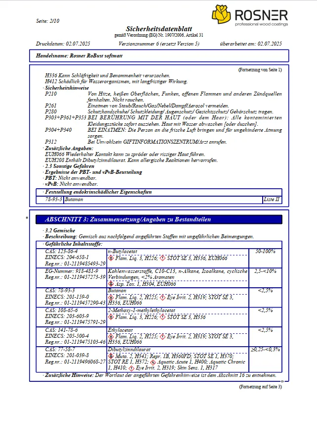 Rosner RoBust softmatt ist ein hochbeständiger, wasserbasierter 2K-PUR-Lack für beanspruchte Holzoberflächen im Möbel- und Innenausbau. Die Oberfläche überzeugt durch einen edlen, softmatten Glanzgrad, eine besonders angenehme Haptik und eine außergewöhnliche Belastbarkeit gegen Abrieb, Kratzer, Chemikalien und Feuchtigkeit – ideal für den professionellen Einsatz im Objektbereich.